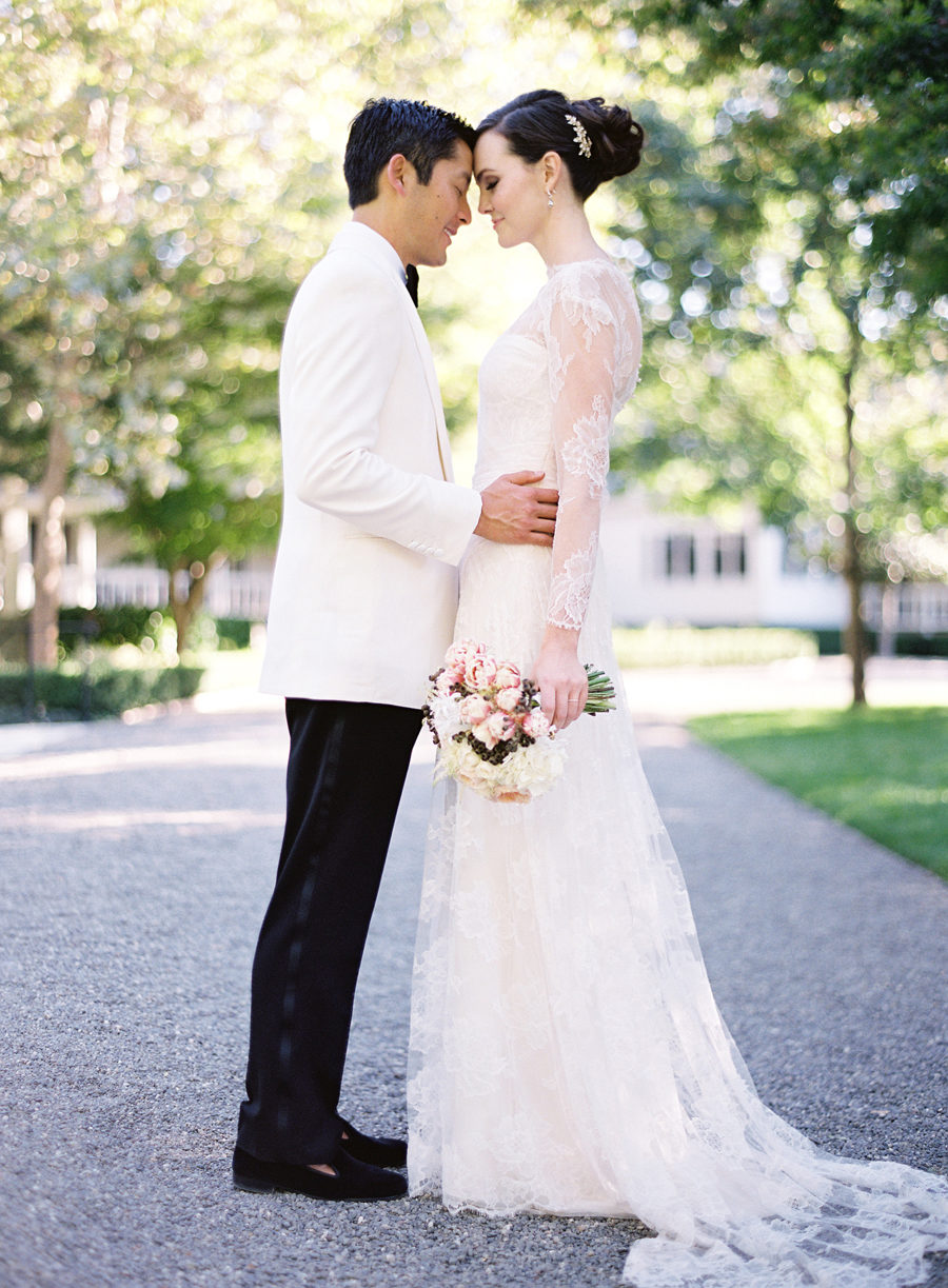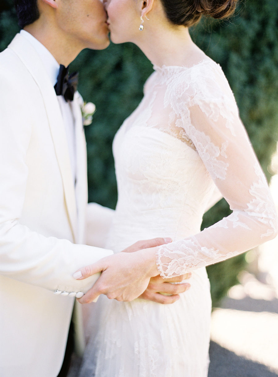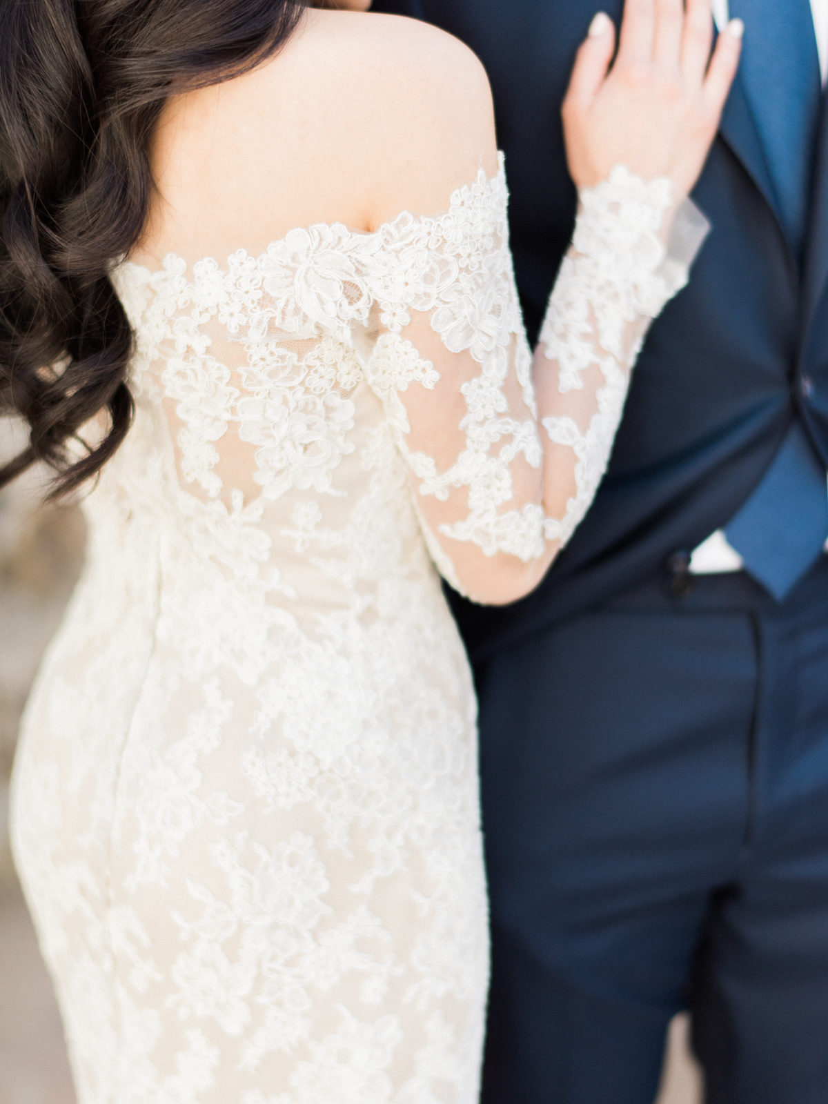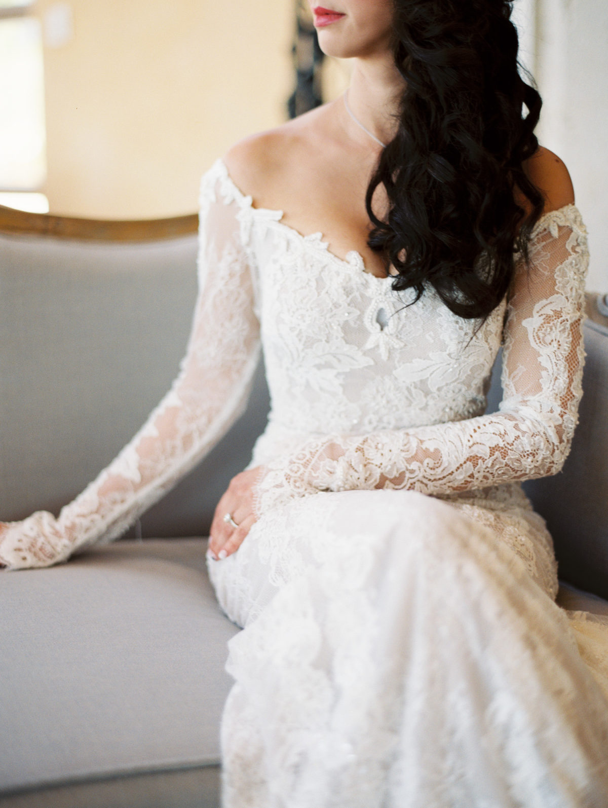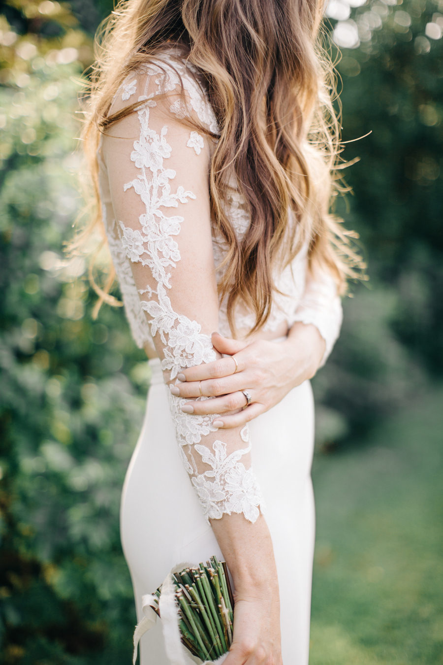 A sheer layer of lace wraps this bride below in elegant style.