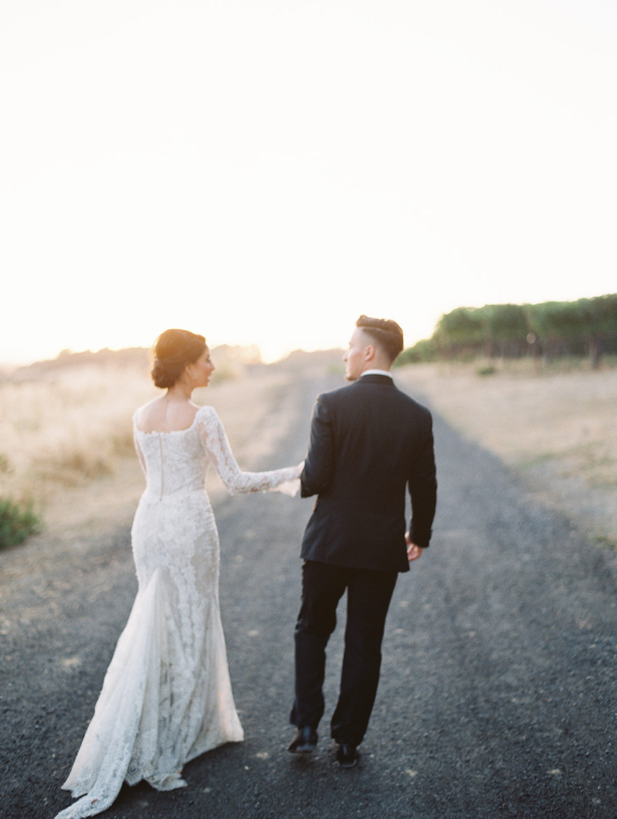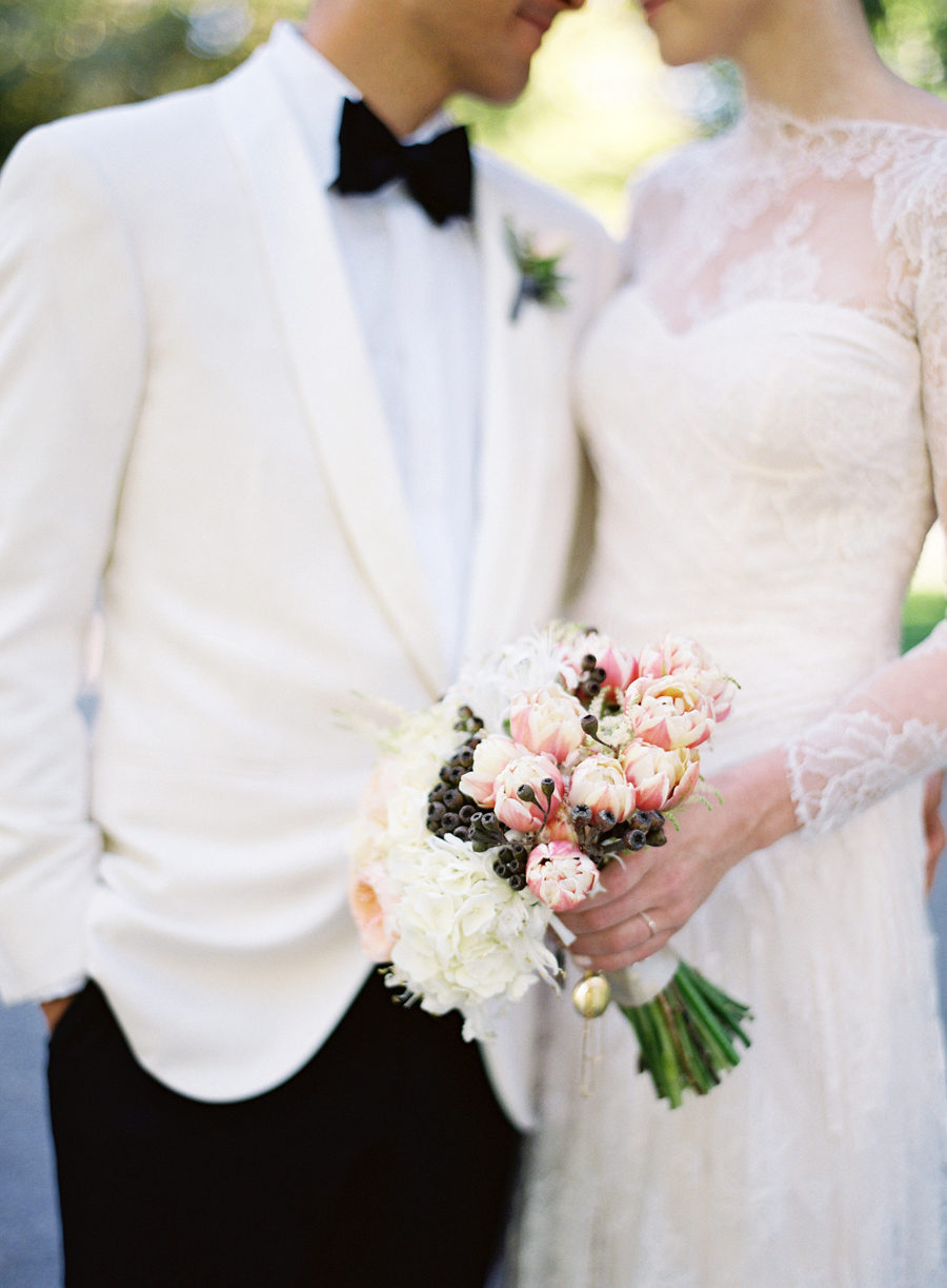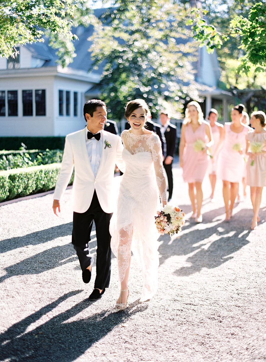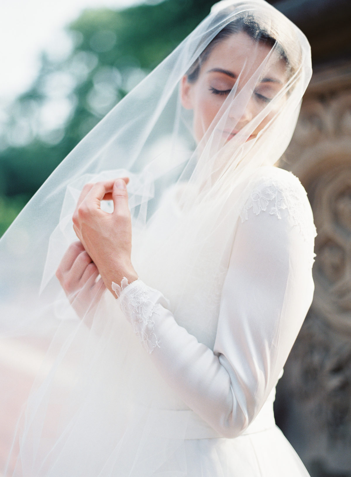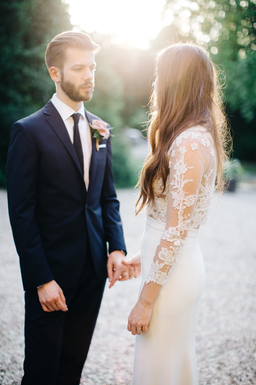 A sheer layer of lace wraps this bride below in elegant style.